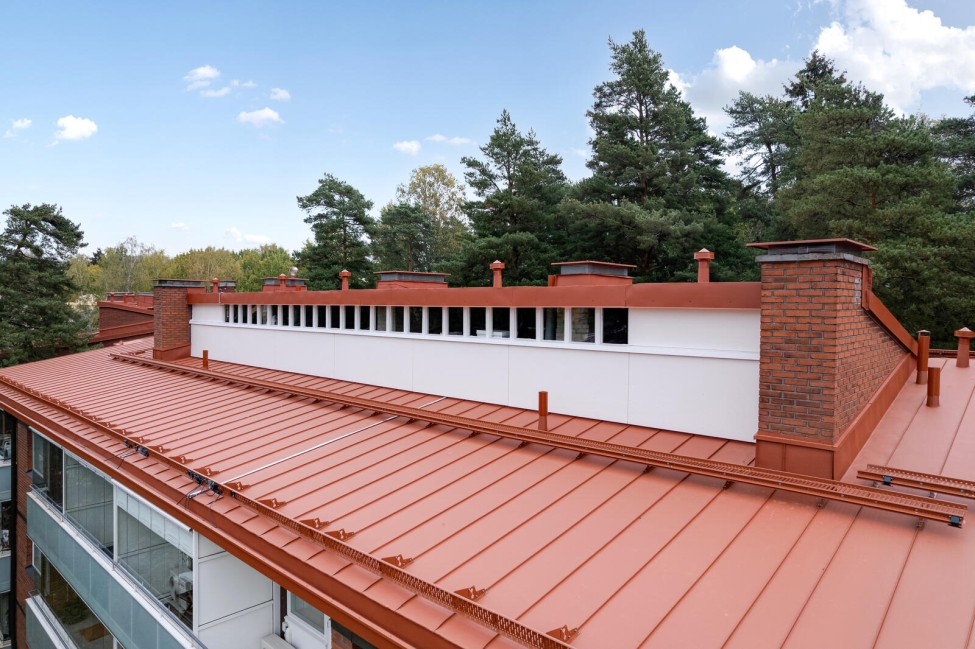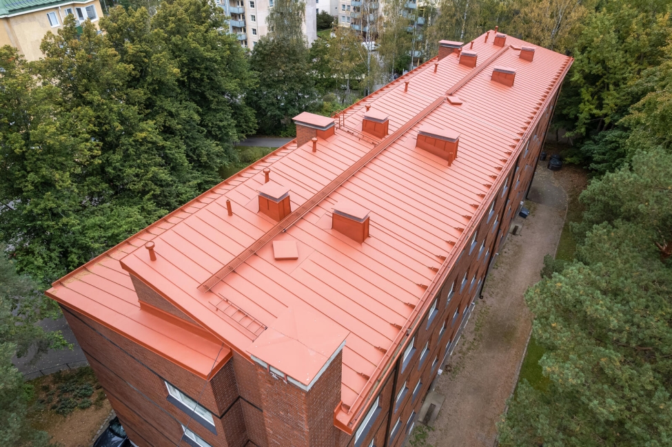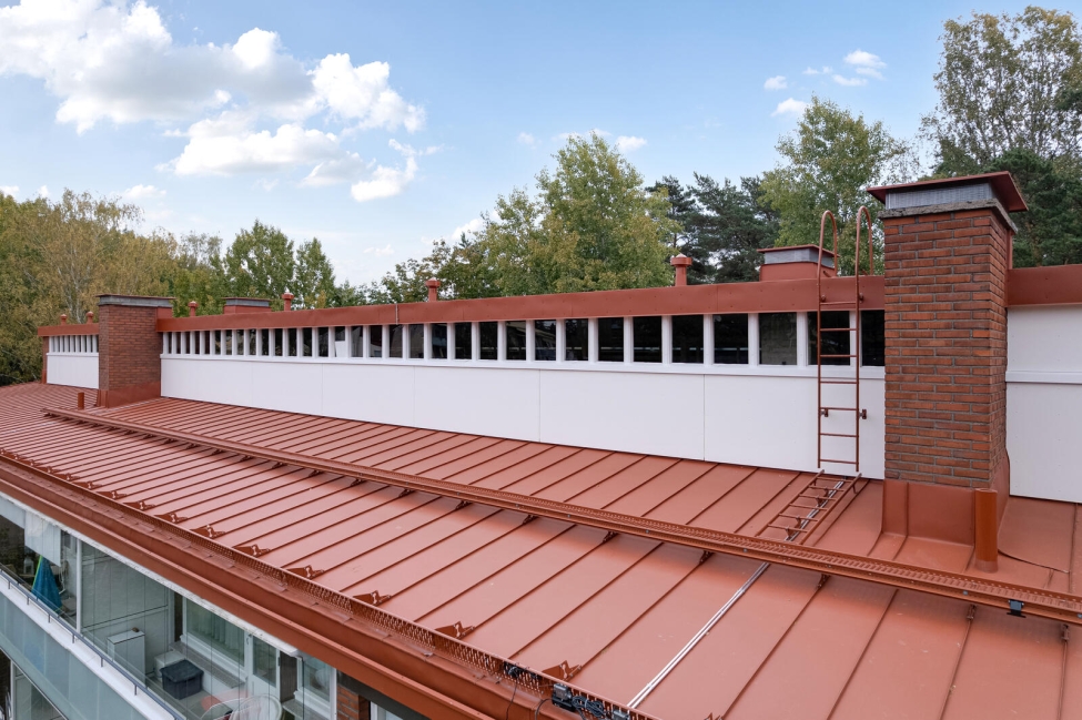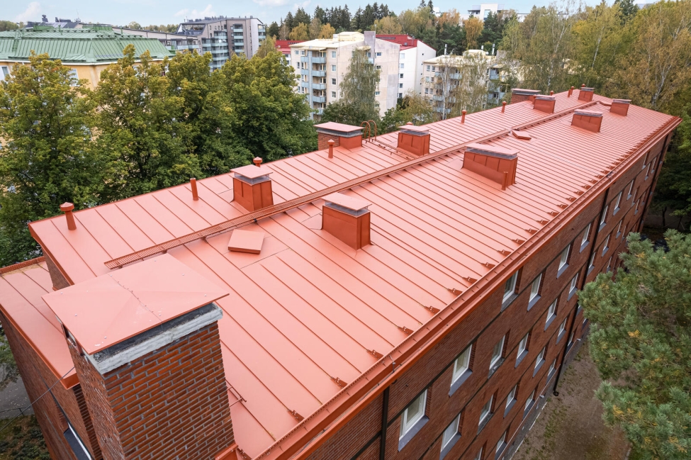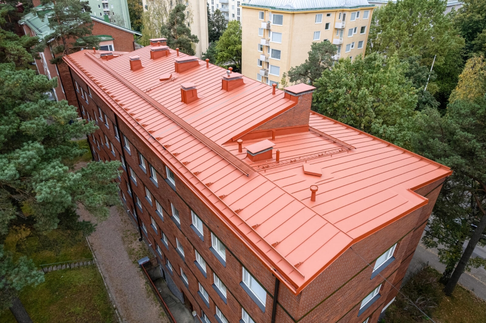 Munkkiniemeläisen taloyhtiön kattoremontissa uusittiin kahden kerrostalon vesikatto alusrakenteineen. Uutta konesaumakattoa syntyi yhteensä noin 1150 m². Koko kattoremontti toteutettiin kevään 2025 aikana sääsuojan alla, mikä varmisti työn korkean laadun ja aikataulussa pysymisen kaikissa olosuhteissa.