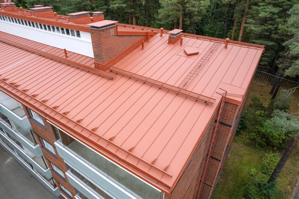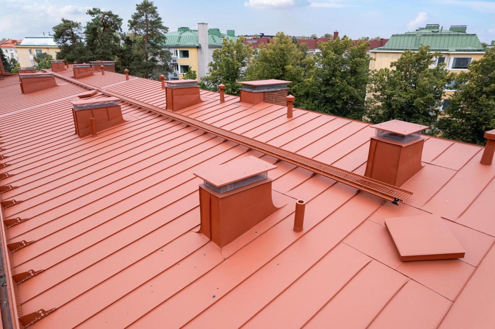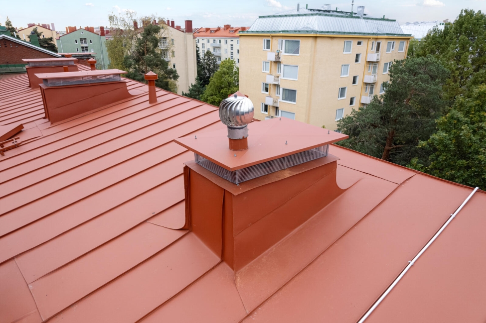 Uusi konesaumakatto sääsuojan alla kahden kerrostalon taloyhtiöön Helsingissä